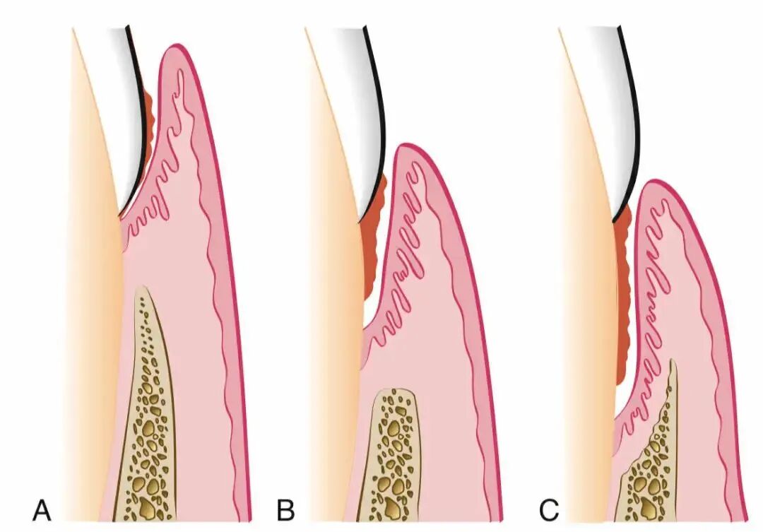 △随着牙周炎的进展,病变越来越深入牙龈深处。