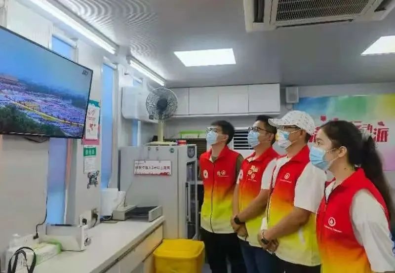 市血液中心集体收看庆祝中国共产党成立100周年大会电视直播,街头采血工作人员在献血车上观看直播。