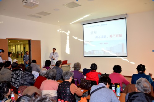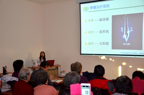 首先贾英杰教授作了以“癌症,并不遥远,并不可怕”为题的讲座,贾英杰教授从癌症的预防,癌症为什么可怕,治疗理念的转变,为什么提倡综合治疗,家属如何做患者的坚强后盾等方面作了介绍。针对目前肿瘤治疗所面临的困境,介绍了综合治疗在肿瘤治疗中的价值,以及中西医结合在肿瘤治疗中的优势,最后介绍了肿瘤科积累的宝贵经验。贾英杰教授的讲座风趣幽默,贴近百姓生活,现场的观众在笑声对肿瘤治疗有了更深一步的认识。