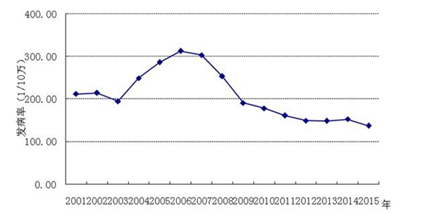 2015年全市16个区、县通过疾病监测信息报告管理系统共共报告丙类传染病7种52903例,死亡2例,报告发病率348.78/10万,报告死亡率0.01/10万。与2014年相比,报告发病率下降18.97%,报告死亡数持平。