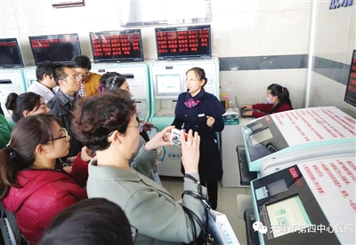 与会人员现场观摩了市第四中心医院门诊、急诊诊疗流程;并到设备维修维护中心、物资配送中心、物业中心等处进行了交流学习,对市第四中心医院从专业化、信息化、智能化入手,构建物资配送、物业管理运行保障体系,更好地提供优质服务给予了高度评价。