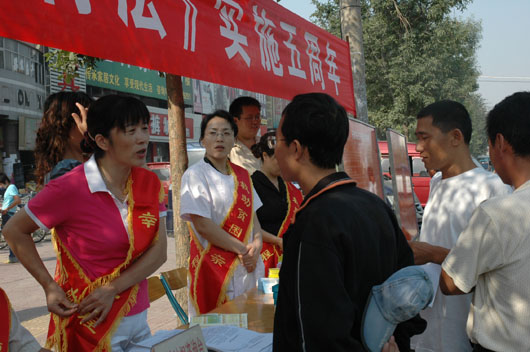 图1:县人口计生委相关科室站人员深入到城关镇开展政策法规、避孕节育、技术服务等咨询服务活动。