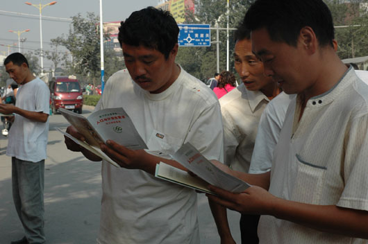 图2:育龄群众在街头学习《人口与计划生育法》宣传册。