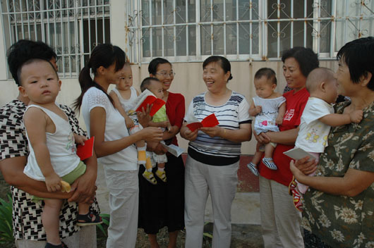 图3:社区计生干部为留守看护孩子的妈妈、奶奶们讲解计划生育法律法规及科学育儿知识。