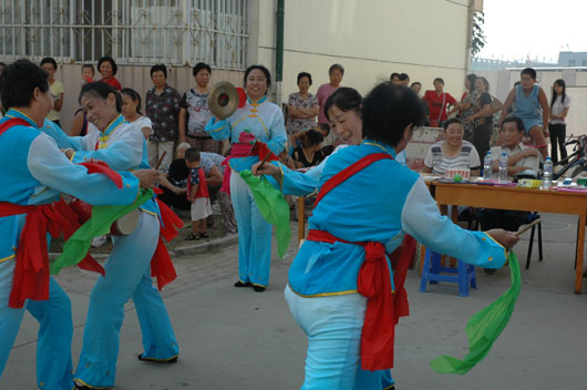 图4:社区文艺宣传队在咨询现场为育龄群众表演自编自演的计划生育文艺节目。