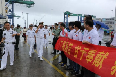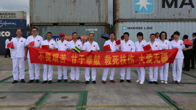 2017年10月1日10时,执行“和平使命-2017”任务中国海军和平方舟医疗船停靠在加蓬奥文多港码头,受到中加两国朋友的热烈欢迎,也受到了在加蓬执行援外医疗任务的中国援加蓬第19批医疗队的列队欢迎。