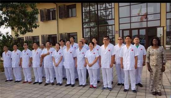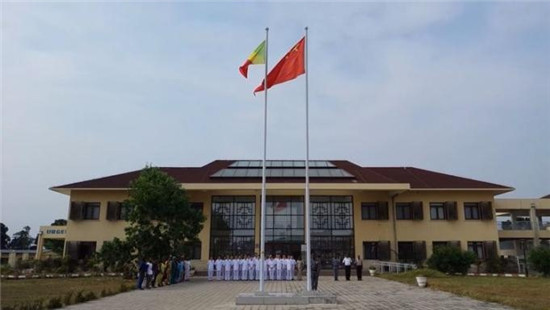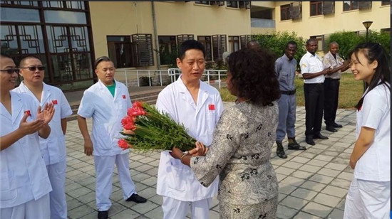 中国援刚果(布)第24批医疗队队长王志勇在升旗仪式上对院长和刚方的医务人员表示欢迎,并代表全体队员祝福祖国生日快乐,表示一定不辱使命,努力工作。