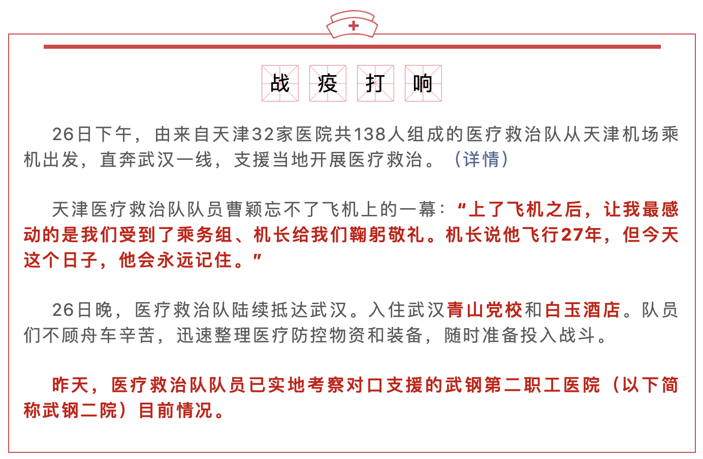 据谢青介绍,本次天津医疗救治队领队、天津医科大学肿瘤医院党委书记陆伟和天津医疗救治队部分队员已实地考察武钢二院目前收治情况,陆伟介绍,从26号夜里转过来(转到武钢二院)30多人,可能陆续还会转,目前收的这些病人大部分还都是轻症,没有特别重的。