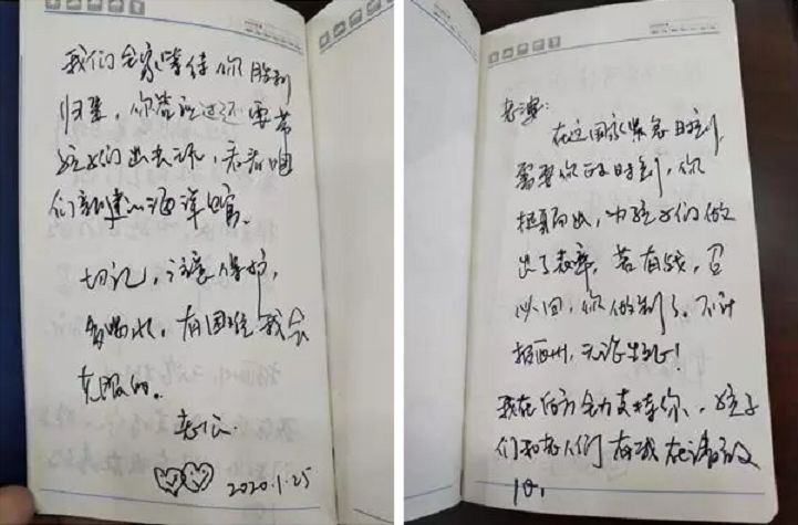 收拾行李时,马广艳发现自己的背包中多了一个日记本,打开一看,里面竟有老公给自己的留言:“老婆:在这国家紧急时刻,需要你的时刻,你挺身而出,为孩子们做出了表率。若有战,召必回,你做到了。不计报酬,无论生死!我在后方全力支持你,孩子们和老人们有我在请放心。我们全家等待你胜利归来,你答应过还要孩子们出去玩,看看新建的海洋馆。切记,注意保护,多喝水,有困难我会克服的。”
