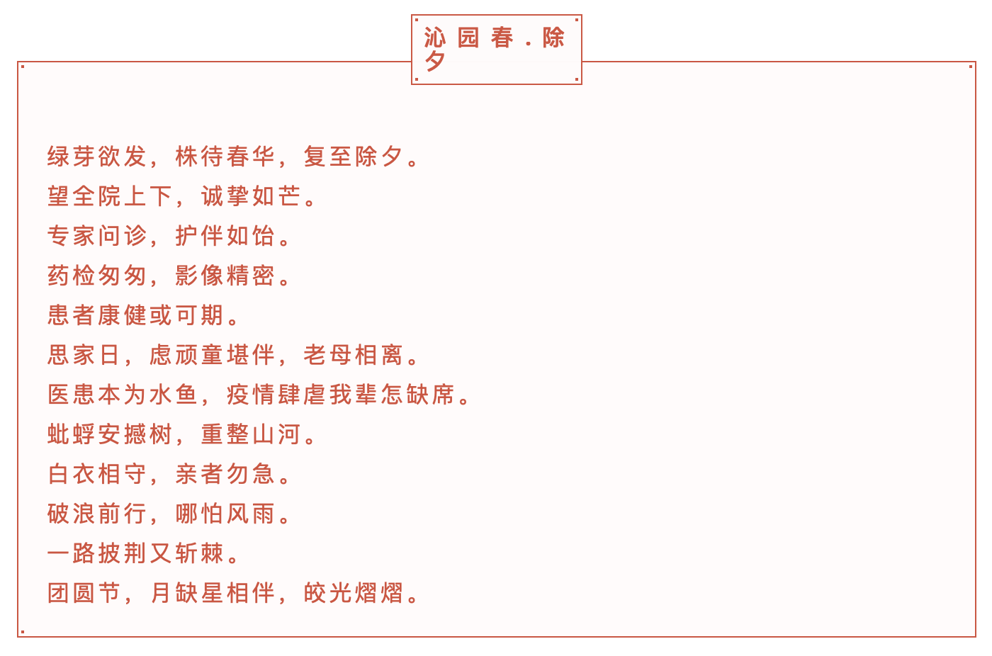 天津市第三中心医院药剂科药师孙士臣赋诗一首:众志成城,除夕坚守岗位且抗击冠状病毒,心有所感,故填此词。
