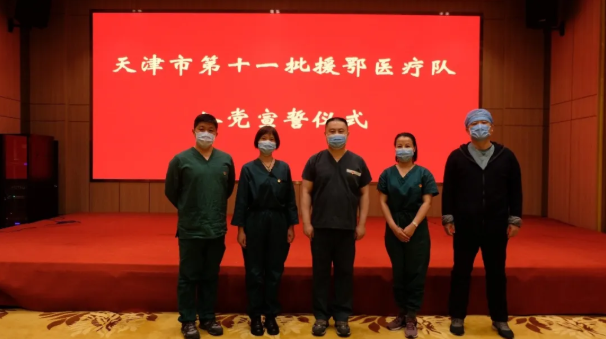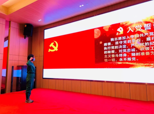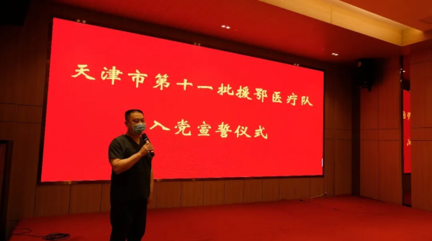 入党宣誓仪式由第11批支援湖北医疗队临时党支部组织委员骆达同志代表临时党总支主持,临时党支部书记佟小光、张国斌,蔺新梅,蔡亚娜同志和全体预备党员参加了本次大会。