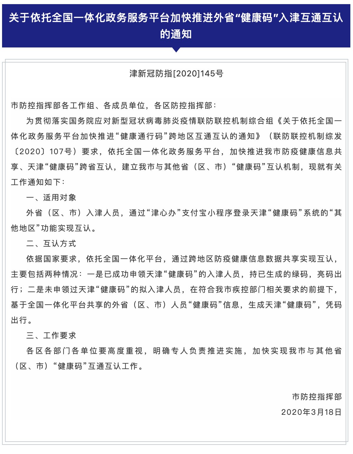 《关于依托全国一体化政务服务平台加快推进外省“健康码”入津互通互认的通知》印发