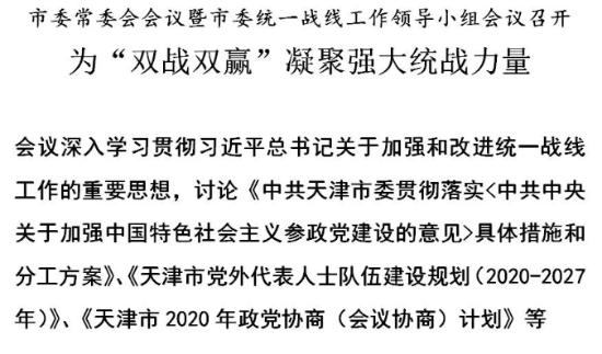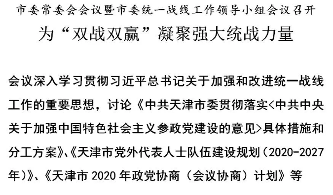 会议讨论《中共天津市委贯彻落实〈中共中央关于加强中国特色社会主义参政党建设的意见〉具体措施和分工方案》、《天津市党外代表人士队伍建设规划(2020-2027年)》、《天津市2020年政党协商(会议协商)计划》、《关于2020年度协商委托各民主党派市委会开展重点考察调研的实施方案》、《关于2020年度协商委托各民主党派市委会开展专项民主监督的实施方案》。会议强调,要着力加强参政党思想政治建设,严把政治首关,压实组织发展、教育管理、内部监督、纪律约束各环节,落实好党外代表人士队伍建设规划,构建风清气正的政治生态。健全完善保障民主党派履行政党协商、重点考察调研、专项民主监督职能的方法,支持民主党派提出更多高站位、小切口、具体化、有见地的“策论”,提升参政议政能力水平。