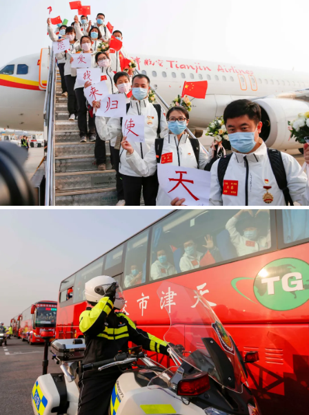 带着1500万海河儿女的深情厚谊,天津支援湖北恩施州医疗队以“竭尽所能、千方百计、全力保证”为己任,胜利完成了对口支援任务。3月24日下午,医疗队第一批返津人员共106人搭乘天津航空专机返回天津。