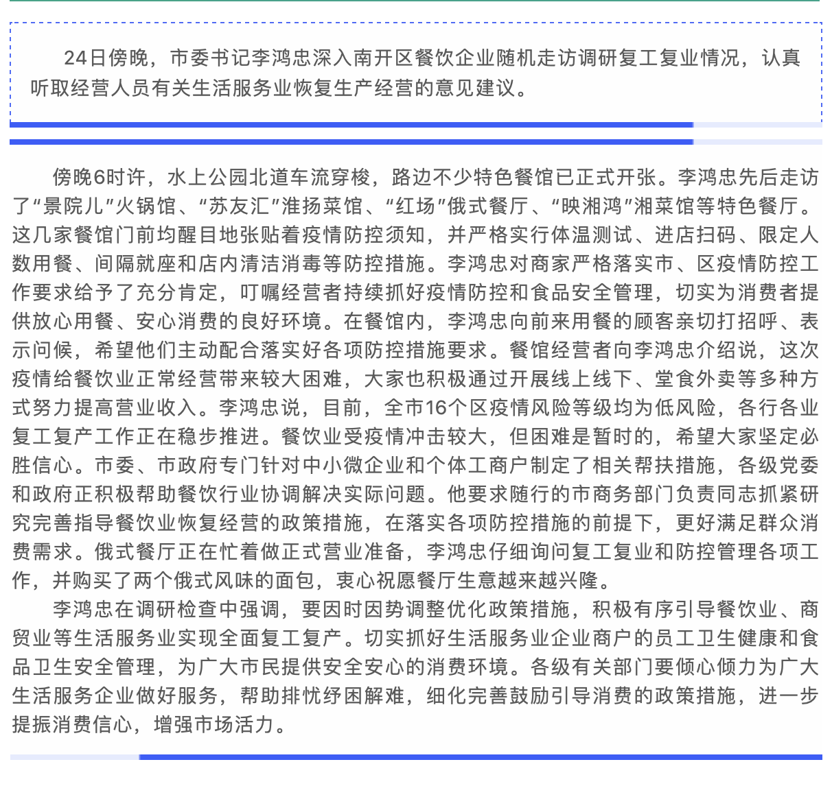 双战 | 李鸿忠到餐饮企业走访调研复工复业情况