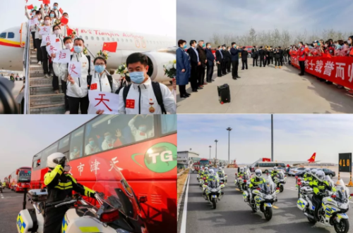 “3月17日傍晚,返程的飞机降落在天津机场,当队员走出机舱看到领导来接机送上鲜花,警车、铁骑护卫队开道,从飞机降落一直到高速路入口,沿途有很多警察向医疗队敬礼致敬,道路两旁警灯闪耀,队员们都是第一次看到和受到如此高级别的礼遇,感受到了市委、市政府领导对我们的重视和厚爱,有些队员也向警察鞠躬致敬,流下了喜悦的热泪。队员们发自内心地说:这场面太震撼了,领导们对我们医疗队太好了,我们归队后一定更加努力做好医疗工作,发扬救死扶伤精神,不断提高天津的医疗救治水平。”