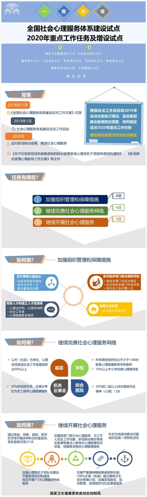 为进一步推进和指导各地规范实施社会心理服务体系建设试点工作(简称试点工作),加强应对新冠肺炎疫情防控、推进心理疏导和社会工作服务,根据试点工作整体目标和2019年试点任务执行情况,2020年4月26日,国家卫生健康委、中央政法委、教育部、公安部、民政部、司法部、财政部、国家信访局、中国残联以办公厅函形式联合印发《关于印发全国社会心理服务体系建设试点2020年重点工作任务及增设试点的通知》。