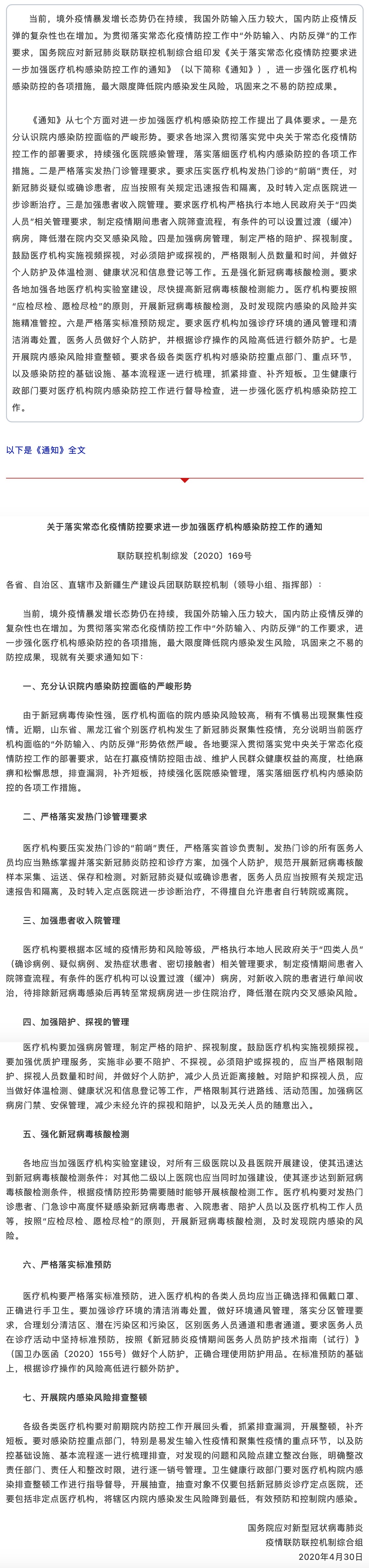 国务院联防联控机制:落实常态化疫情防控要求进一步加强医疗机构感染防控工作