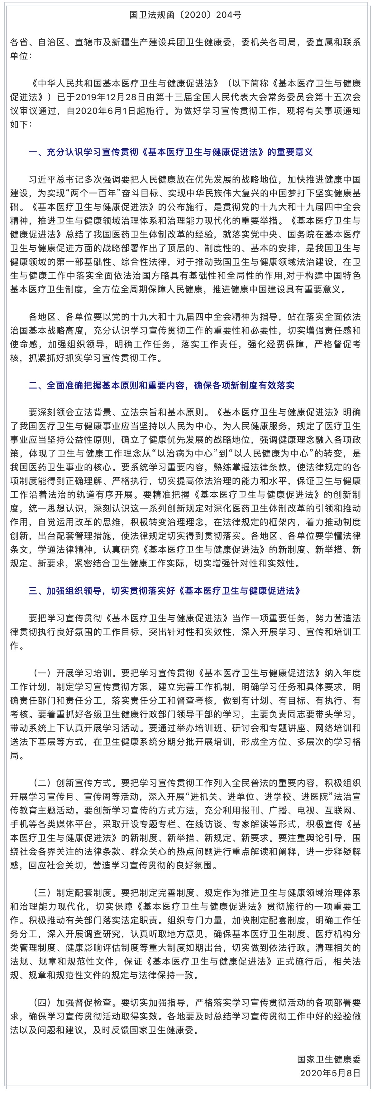国家卫生健康委关于学习宣传贯彻《中华人民共和国基本医疗卫生与健康促进法》的通知