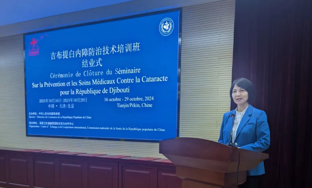 王健副主任对吉布提学员顺利完成培训表示祝贺,对天津市卫生健康委的精心组织和各医疗单位机构的辛勤付出表示肯定和感谢,并强调,本次培训向吉布提同仁分享白内障防治的技术成果和临床经验,展现中国医药产业发展势头,希望双方今后能够在卫生健康领域开展更为广泛、深入的交流和合作,让更多优质的医疗服务惠及两国民众。阿布迪拉伊副主任对中方的盛情接待表示衷心感谢,指出这是一次充实丰富且愉快的学习交流之行,不仅帮助吉布提学员们提升医学技能,也了解了中国的文化传统和创新精神,同时对今后进一步交流合作充满期待。李洁副主任指出,通过双方医疗届同仁的友好交流,天津与吉布提建立了宝贵的跨国友谊,本次培训圆满结束不是终点,是卫生合作、建立友谊的新起点,希望双方赓续友谊、促进交流,共同在中非卫生合作中做出更多新实践。