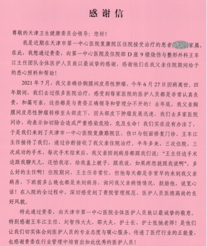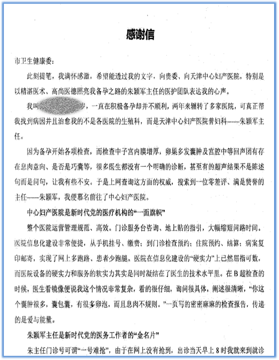 患者致谢市中心妇产科医院普妇科朱颖军主任团队全体医务人员