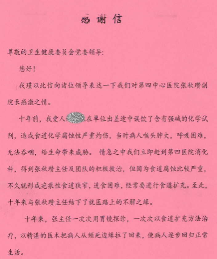 患者家属致谢市第四中心医院张秋瓒副院长(时任)及消化科全体医务人员