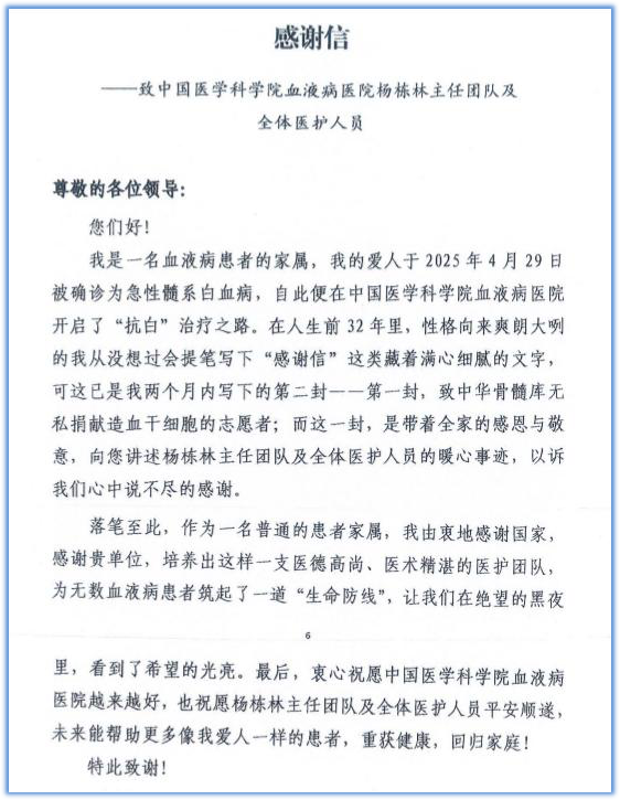 患者家属致谢中国医学科学院血液病医院移植中心杨栋林主任团队全体医务人员