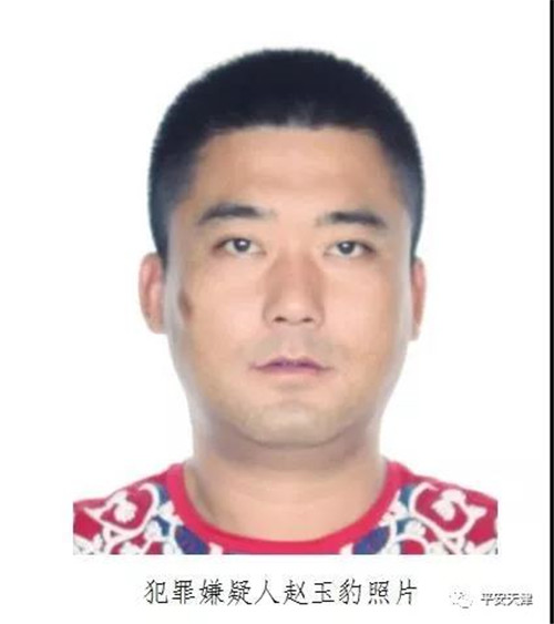 3、赵玉豹,男,汉族,1981年9月22日出生,身高1.72米左右,圆脸,体态中等,面部右侧有明显伤疤,天津市宁河区口音,户籍地:天津市宁河区芦台镇张北村一区1排1号,身份证号:120221198109220311。