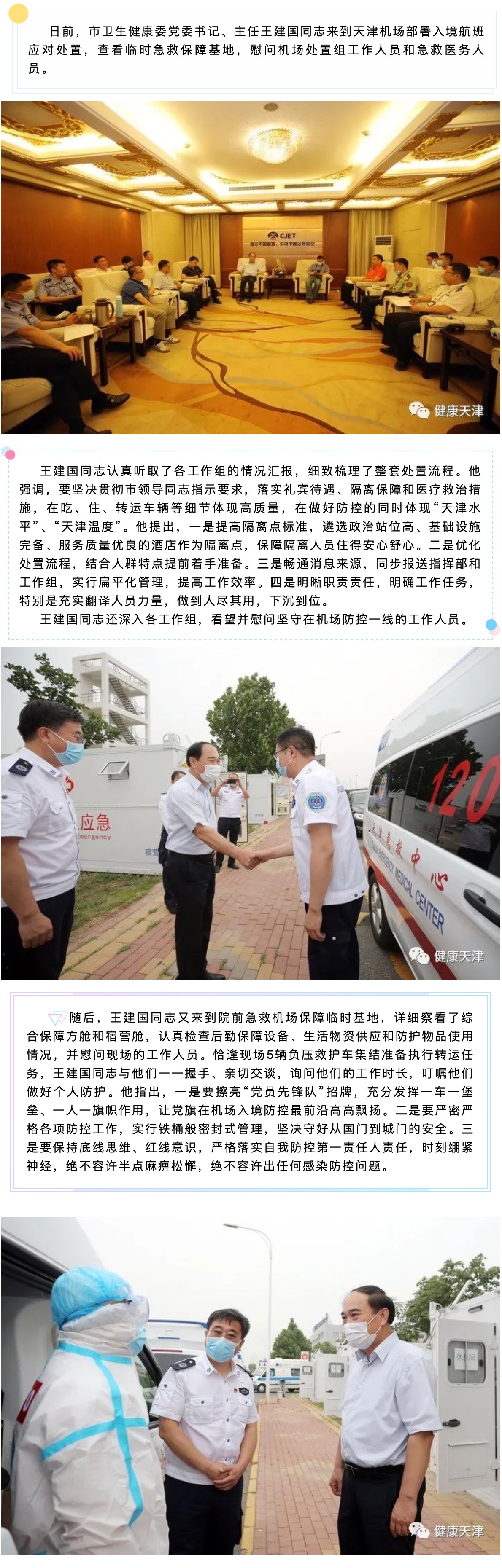 王建国同志赴天津机场部署入境航班应对处置 查看临时急救保障基地 慰问工作人员和急救人员