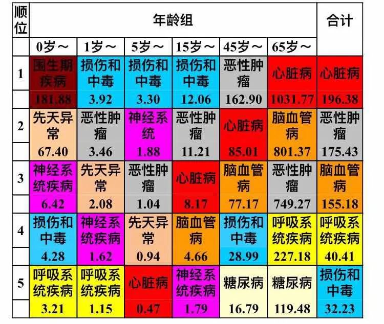 2019年天津市不同年龄人群死因顺位(死亡率1/10万)