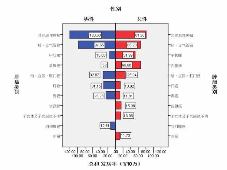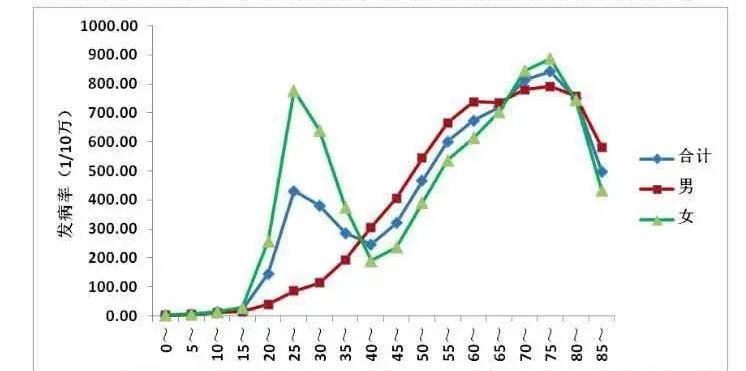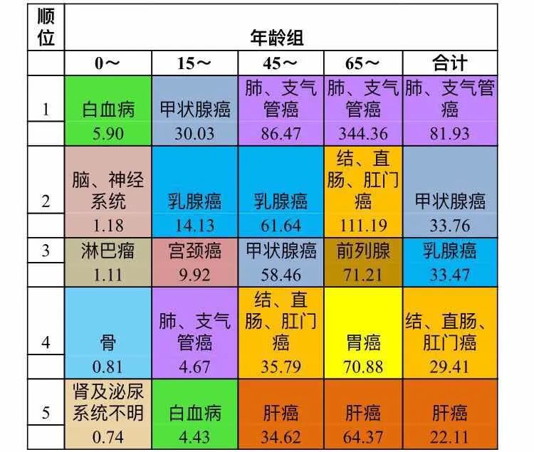 2019年天津市不同年龄组人群前5位恶性肿瘤发病率(1/10万)