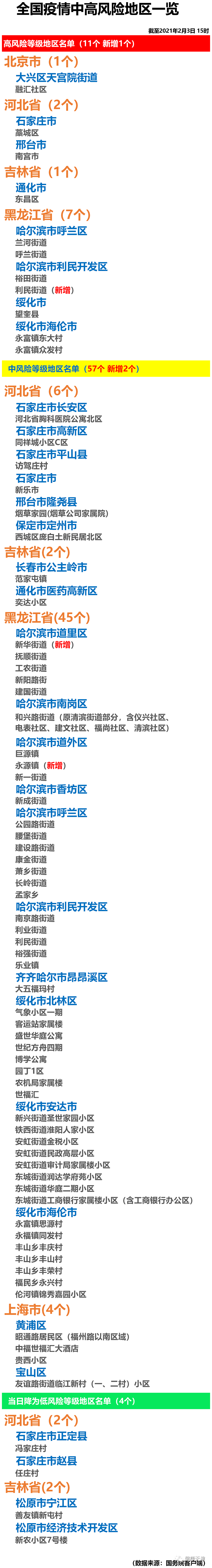 全国疫情中高风险地区一览(2021年2月3日)