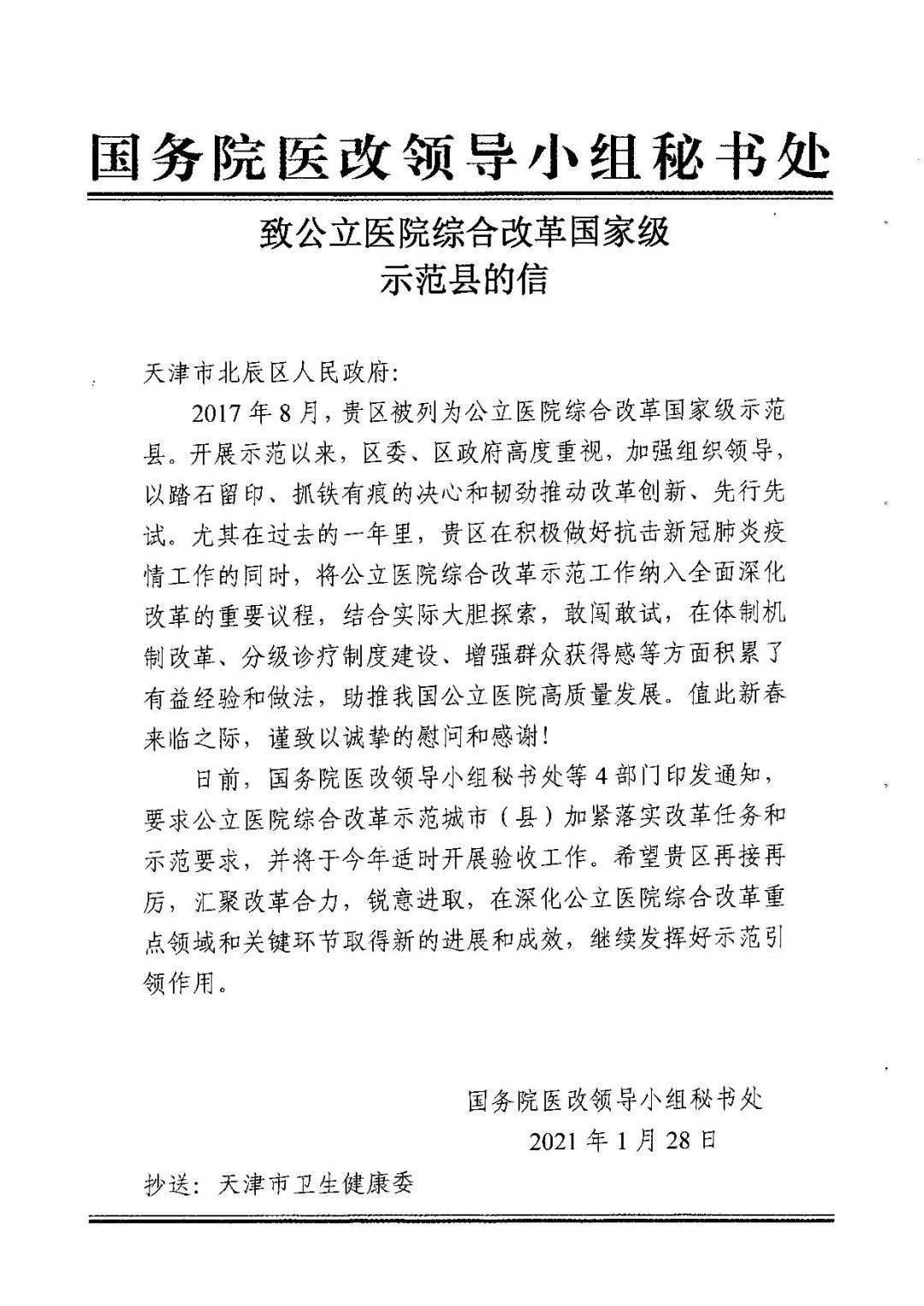 近日,市卫生健康委收到国务院医改领导小组秘书处发来的感谢信,信中对天津市卫生健康委、北辰区公立医院综合改革国家级示范区,天津医科大学总医院、北辰区中医医院、市第四中心医院等四所国家建立健全现代医院管理制度试点医院在提升医疗卫生服务水平、探索现代医院管理制度等推动医药卫生体制改革方面做出的贡献表示肯定与感谢。