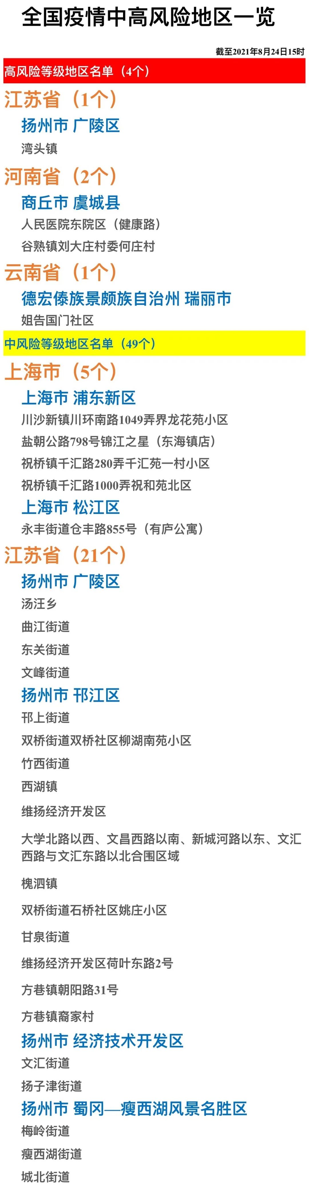 全国疫情中高风险地区一览(2021年8月24日)