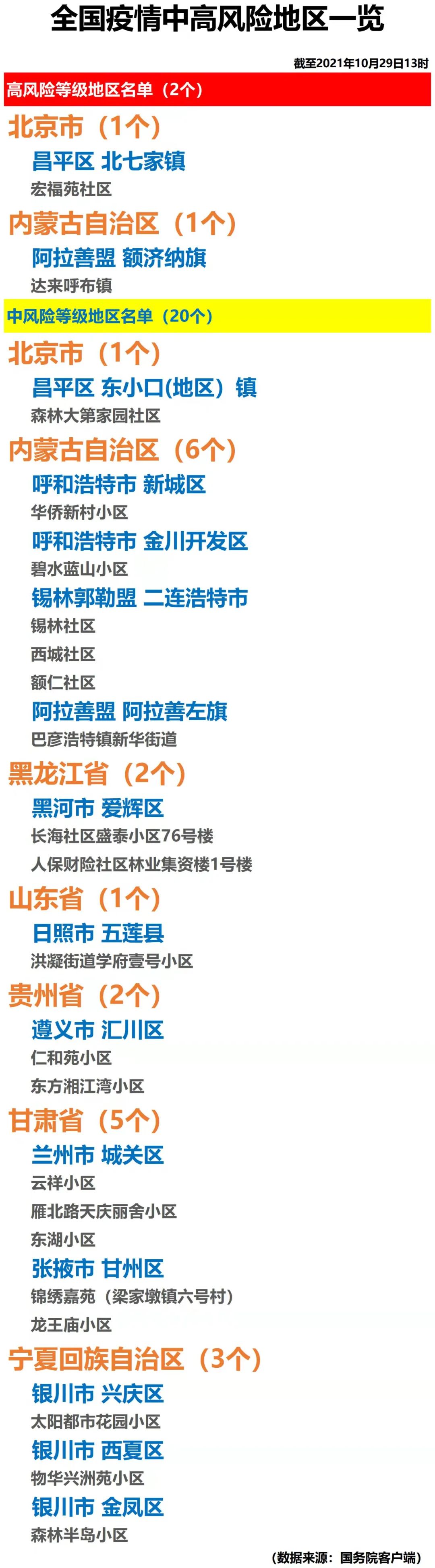 全国疫情中高风险地区一览(2021年10月29日)