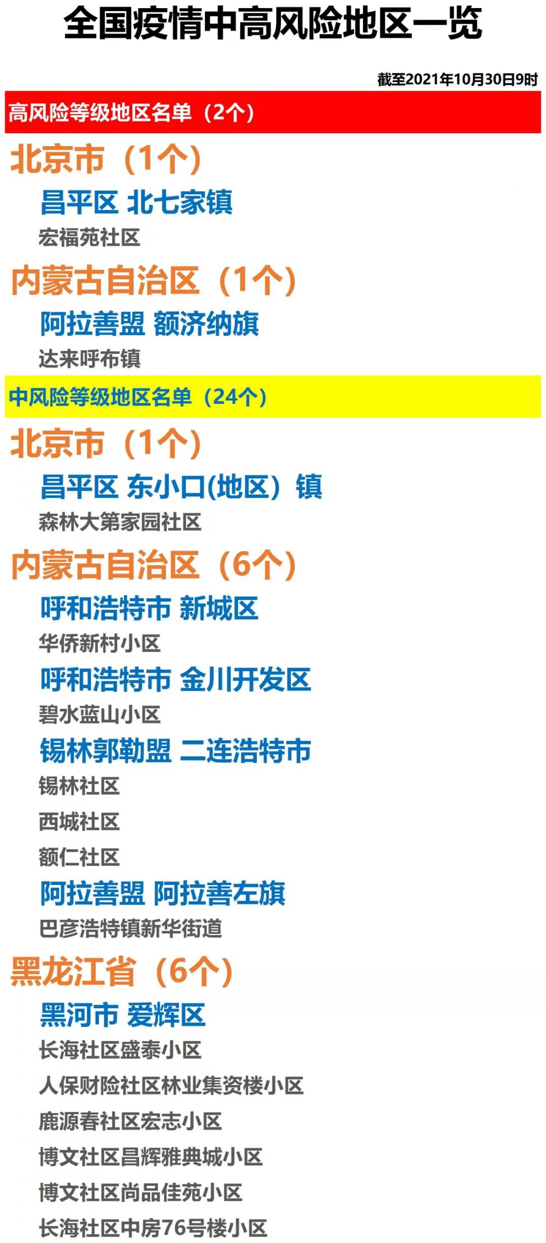 全国疫情中高风险地区一览(2021年10月30日)