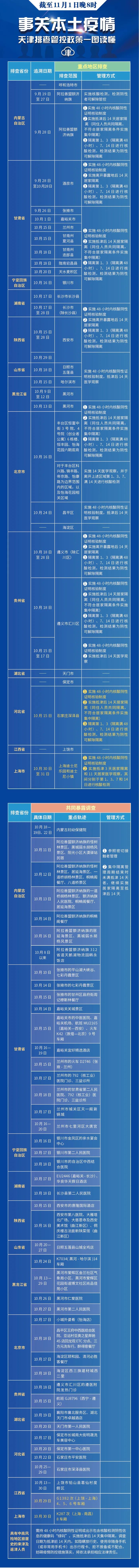 二、经过流行病学调查后,涉及下述流行病学史:10月29日途经江西省上饶市乘坐G1382次(上饶-上海)4、5、6号车厢,10月30日途经上海市乘坐K287次(上海-南昌)8车厢,均为感染者轨迹重合人员,参照密切接触者管理,集中隔离管理周期结束时未满抵津14天者,继续实施居家隔离至抵津后14天。