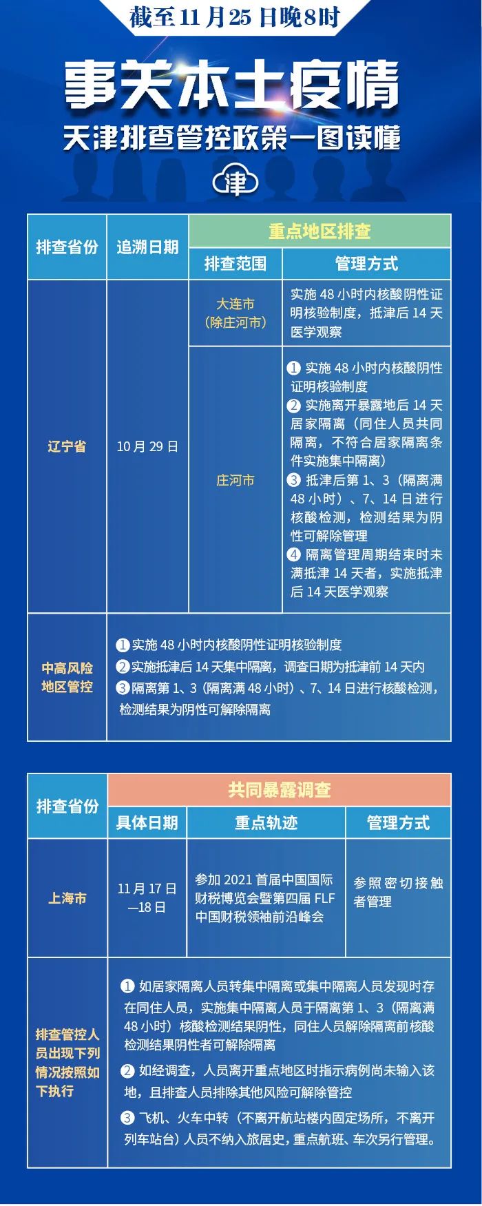 二、经过流行病学调查后,涉及下述流行病学史:11月17日至18日参加2021首届中国国际财税博览会暨第四届FLF中国财税领袖前沿峰会,均为感染者轨迹重合人员,参照密切接触者管理,集中隔离管理周期结束时未满抵津14天者,继续实施居家医学观察至抵津后14天,第14天核酸检测结果为阴性可解除管理。