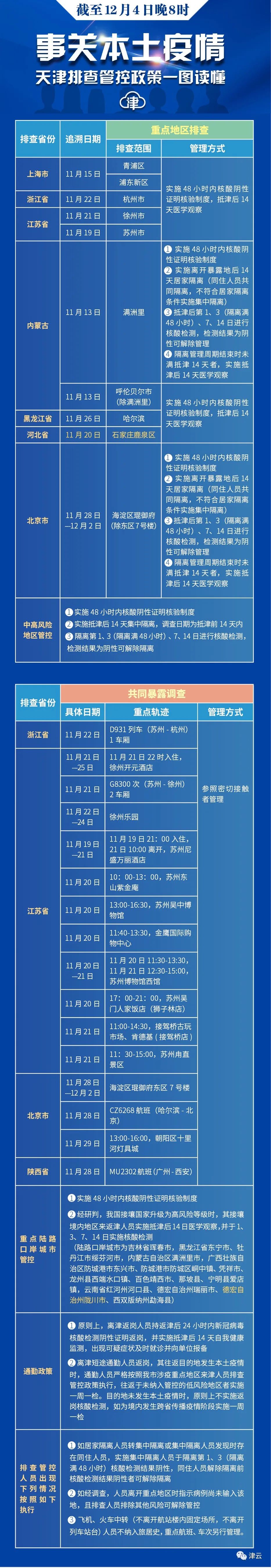 二、重点陆路口岸城市管控:经研判,新增德宏自治州陇川市为高风险陆路口岸城市,来返津人员需持48小时内核酸阴性证明或出示包含核酸检测阴性信息的健康码“绿码”,并实施抵津后14日医学观察,并于1、3、7、14日实施核酸检测。