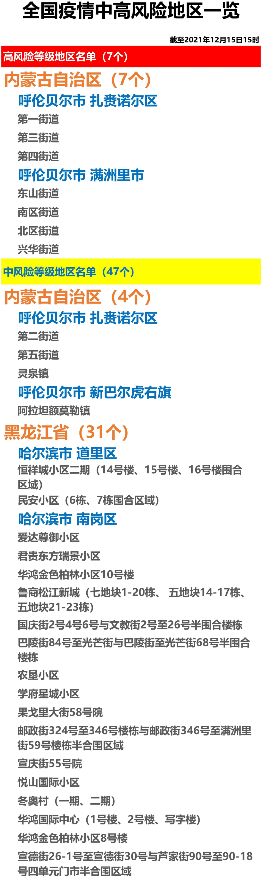 全国疫情中高风险地区一览(2021年12月15日)