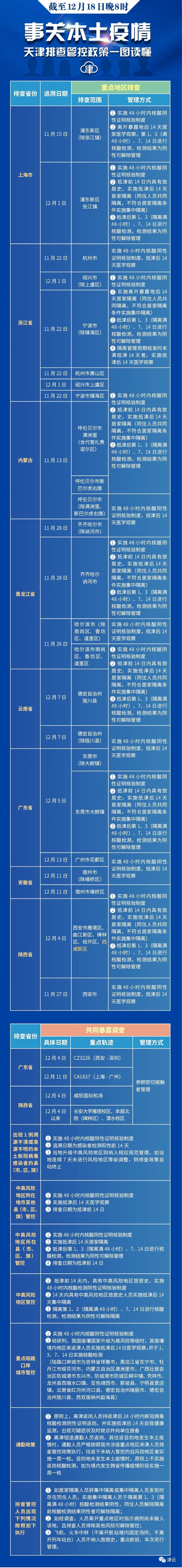 相关人员主动报备。新增具有12月4日(含)以来途经陕西省西安市西咸新区旅居史的来津及返津人员,需持48小时内核酸阴性证明或出示包含核酸检测阴性信息的健康码“绿码”,主动向社区、工作单位等报备,抵津前14日具有上述旅居史则实施抵津后14天居家隔离(同住人员共同隔离,不符合居家隔离条件实施集中隔离)。