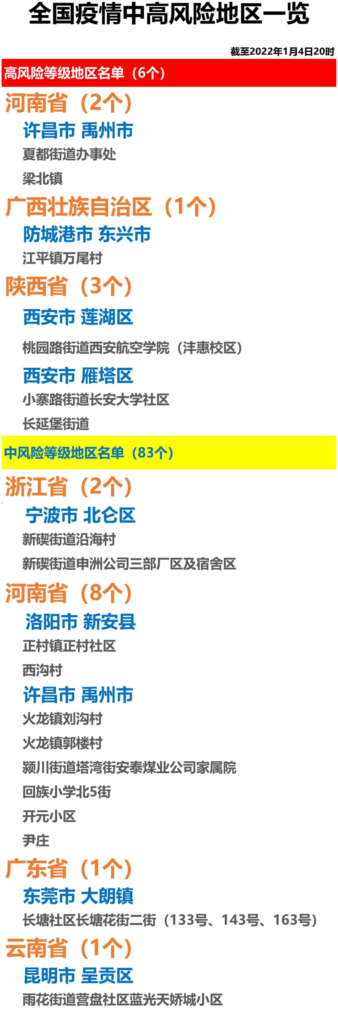 全国疫情中高风险地区一览(2022年1月4日)