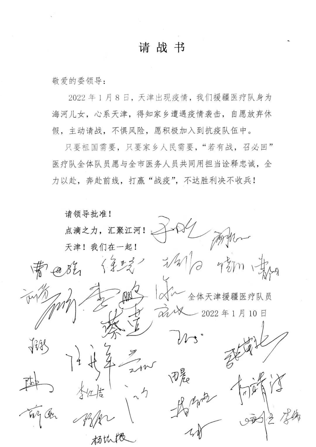 在津休整的援疆医疗队员,在获悉我市津南区出现新冠肺炎阳性病例后,30名队员第一时间集体签名递交请战书,自愿放弃休假,主动请缨,参与疫情防控。发扬了挺身而出,舍我其谁的战斗精神。
