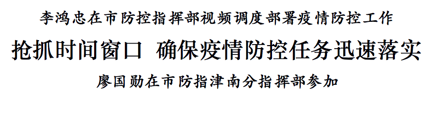 在调度部署中,李鸿忠与在市防指津南分指挥部的市委副书记、市长廖国勋进行视频连线,研究部署津南区防控工作;分别与和平、河东、河西、南开、静海、宁河等区指挥部视频通话,详细询问重点任务具体落实情况;电话联系市相关部门主要负责同志,部署交办重点工作事项。