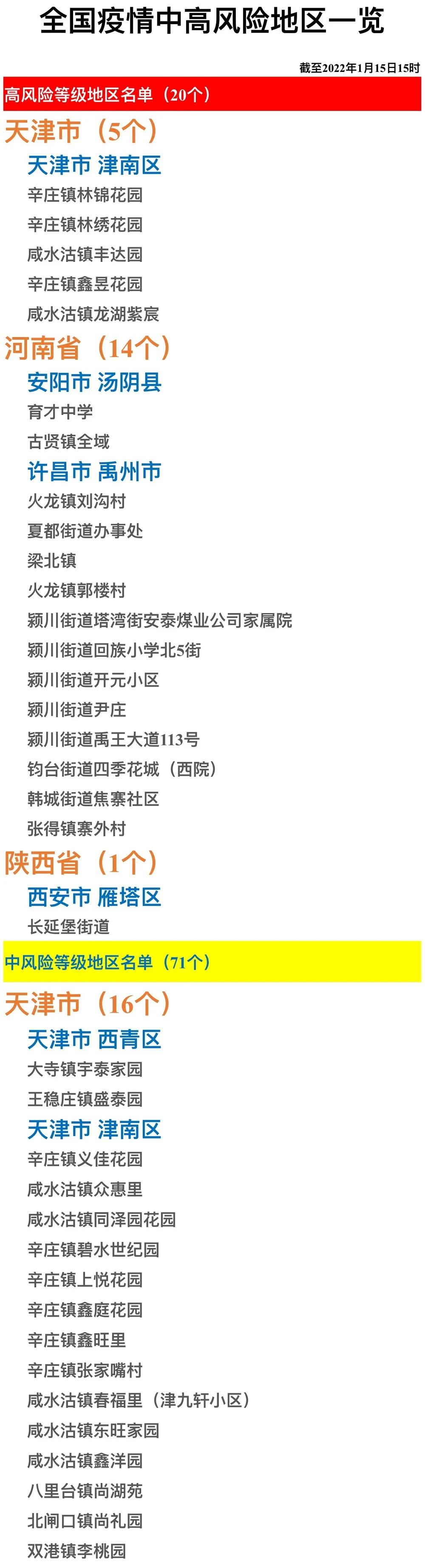 全国疫情中高风险地区一览(2022年1月15日)