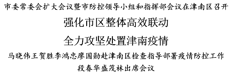 15日晚,市委常委会扩大会议暨市防控领导小组和指挥部会议在津南区召开,通报全市疫情防控工作进展情况,研究会商、推动解决津南区疫情处置问题,全力打好打赢社会面“清零”攻坚战。市委书记、市防控领导小组组长李鸿忠,市委副书记、市长、市防控指挥部总指挥廖国勋作部署,市人大常委会主任段春华、市政协主席盛茂林出席。