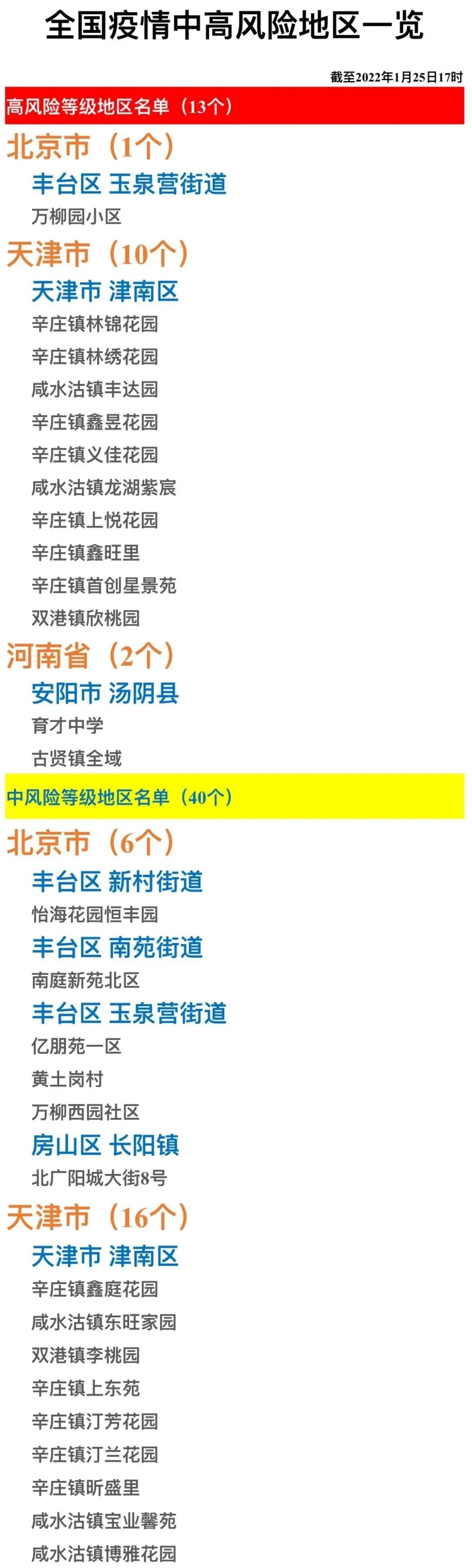 全国疫情中高风险地区一览(2022年1月25日)