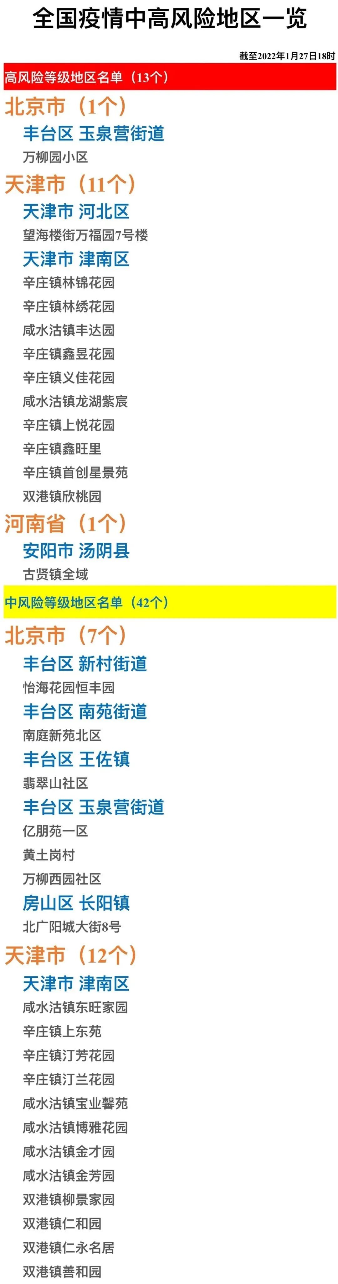 全国疫情中高风险地区一览(2022年1月27日)
