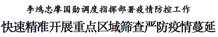 李鸿忠、廖国勋指出,当前,我市疫情防控形势仍然严峻复杂。特别是近期在河北区发生的津南关联疫情再次敲响了警钟,我们决不能有丝毫松懈。要高度重视奥密克戎病毒传播速度快、隐匿性强的特点,密切关注疫情发展态势,始终保持各区应急指挥体系“热备”状态,各项防控工作要更早、更及时、更有力,争分夺秒、刻不容缓坚决果断有力采取措施,确保快速阻断传播渠道、严防疫情蔓延。要根据疫情动态科学划定封控管控范围,立即对重点区域采取严格管理措施,严格执行社区管控要求,充分发挥基层党组织优势,加强社区管理服务保障。迅速调集全市人力、设备资源,及时组织开展重点区域全员核酸筛查。坚持由点到面、点面结合,集中力量对重点风险区域、重点人员开展筛查检测。深入开展“敲门行动”,确保筛查工作效率、精准度,确保不漏一户一人。坚持边检测、边流调、边筛查,综合用好大数据和面对面流调等手段,不放过任何线索,尽快摸清风险底数,加快推送协查信息,坚决堵住传染源头、切断传播链条。进一步发挥医疗机构、发热门诊、药店等“哨点”作用,确保应急反应快速、灵敏。压实集中隔离点管理责任,不折不扣落实“三区两通道”和闭环管理要求,加强医护、服务人员培训,从严遵守隔离规程,严格落实每日核酸检测、健康监测等措施。全力加强物资供应,储备充足防疫物资和生活必需品,切实维护市场秩序,保障满足疫情期间群众日常生活和基本就医需求。