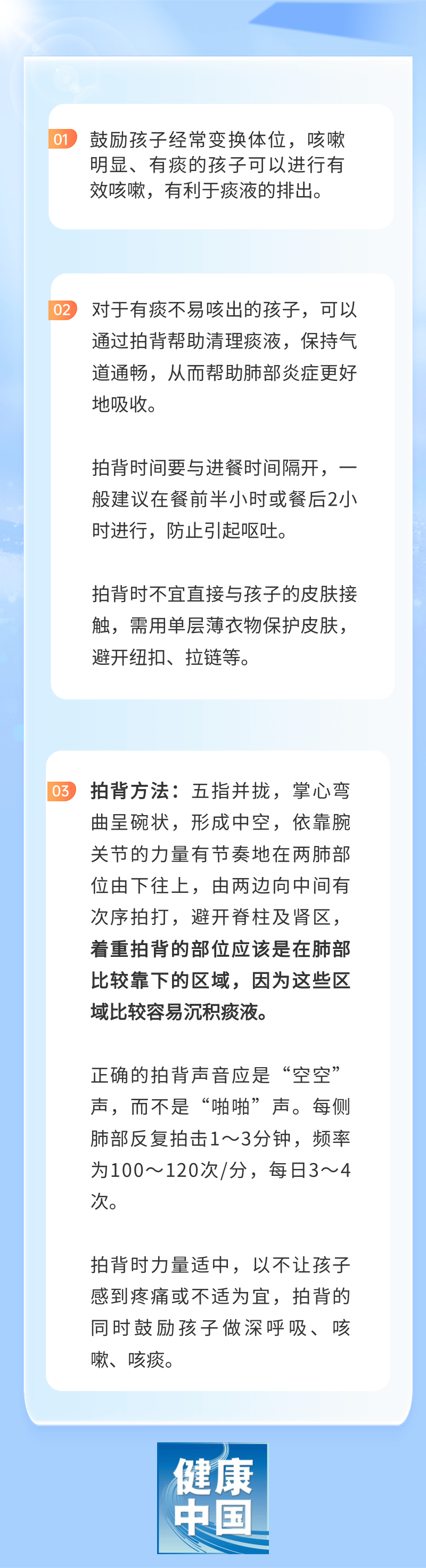 咳嗽是一种症状而不是疾病,是孩子生病时的“报警信号”。由于儿童咳嗽反射较弱,痰液容易在气道内潴留引起气道阻塞,这时通过拍背排痰,可以促进痰液排出,保持呼吸道通畅。